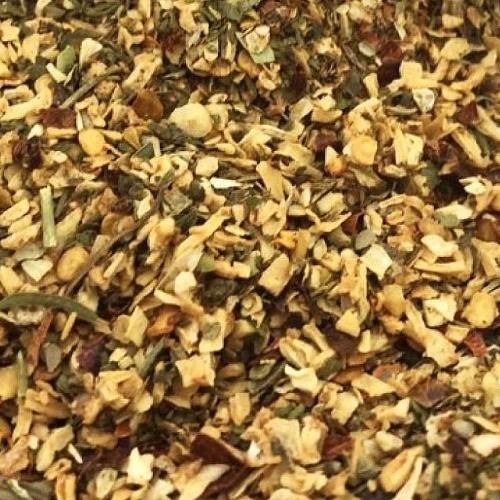 Cebola desidratada, alho desidratado, salsa, tomilho, manjerona, cebolinha, segurelha, manjericão, orégano, pimentão verde desidratado, pimentão vermelho desidratado e tomate em flocos. NÃO CONTÉM GLÚTEN.