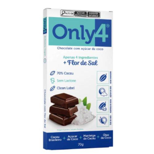 O Chocolate 70% Cacau com Flor de Sal 70g Only4 é um chocolate 70% cacau leve, feito com açúcar de coco, sem adoçantes ou açúcares refinados. Livre de ingredientes de origem animal, vegano e delicioso, o Only4 é produzido com somente 4 ingredientes: massa de cacau, açúcar de coco, manteiga de cacau e óleo de coco, ideal para quem ama chocolate, mas não consome produtos de origem animal ou tem intolerância a leite de vaca.