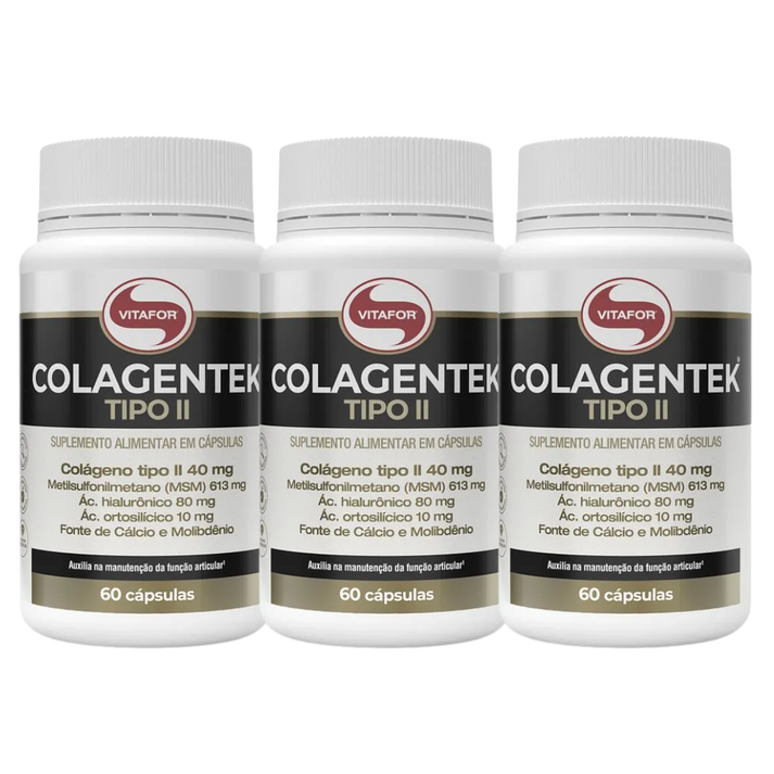 O Colagentek Tipo 2 60 Cápsulas Vitafor é um suplemento alimentar em cápsulas com nova fórmula à base de colágeno tipo 2, metilsulfonilmetano (MSM),ácido hialurônico, extrato de alho em pó (Allium sativum L.) e minerais, fonte de cálcio e molibdênio. Além de conter zero adição de açúcares. Com sua alta tecnologia, o Colagentek proporciona diversos benefícios para a saúde dos ossos e articulações.