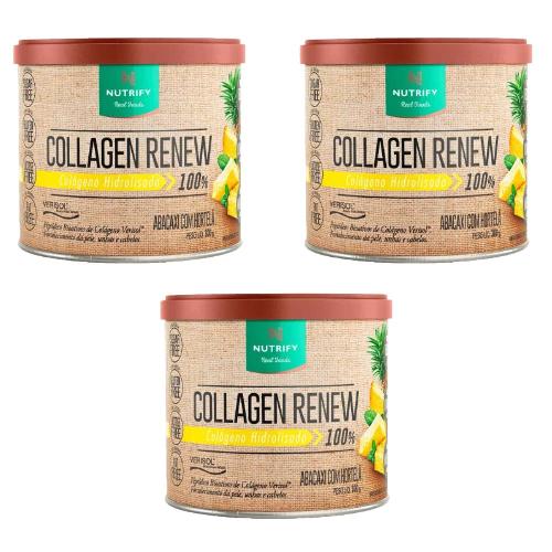 O Kit 3 Collagen Renew Abacaxi com Hortelã 300g Nutrify é um suplemento alimentar responsável por diversos benefícios ao nosso corpo, desenvolvido exclusivamente para auxiliar na manutenção da saúde da pele, realizando o processo de nutrição de dentro pra fora. A cada porção de 10g do Collagen, são fornecidos 2,5g de colágeno hidrolisado Verisol. O Colágeno Hidrolisado possui uma melhor absorção do corpo, ou seja, o resultado é ainda mais rápido, numa combinação única de peptídeos bioativos de colágeno.