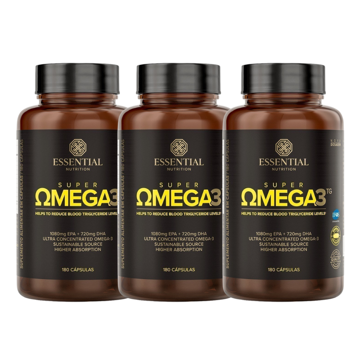 O Kit 3 Super Ômega 3 TG 1000mg 180 Cápsulas Essential é um tipo de gordura boa, ele tem como benefício sua ação anti-inflamatória e que, por isso, é muito utilizado para controlar os níveis de colesterol e glicemia ou ajudar na prevenção doenças cardiovasculares e cerebrais, além de melhorar a memória e a disposição.