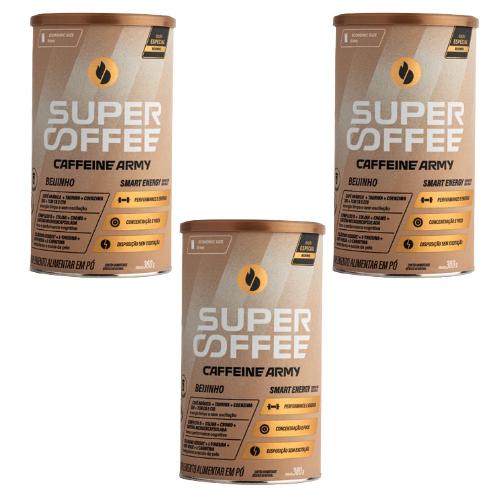O Kit 3 Supercoffee Beijinho 380g Caffeine Army é o mais novo lançamento da Supercoffee no delicioso sabor de Beijinho. Rende até 38 doses da melhor combinação entre o funcional e o sabor. O Supercoffee é uma bebida energética à base de café, com mais de 11 ingredientes naturais, possui em sua composição o TCM. O melhor combustível para o organismo, ele converte rapidamente em energia que liga o seu corpo e mente, capaz de mantê-los nesse estado por horas, sem picos e sem falhas, proporcionando mais energia e disposição, otimizando sua queima de gordura e tornando seu dia mais produtivo - com mais foco e concentração. São 38 doses da combinação perfeita, que alinha o funcional com ingredientes saborosos naturais, que proporcionam a dose certa de energia limpa, estável e duradoura.