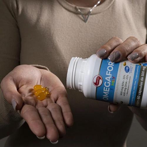 O Omegafor Family 60 Cápsulas Vitafor é um suplemento alimentar em cápsulas no formato de peixinho, à base do óleo de peixe, mas sem odor. Fonte de ômega 3 -TG, composto por ácidos graxos como 600mg de EPA (eicosapentaenóico) e 400mg de DHA (docosahexaenóico), que auxiliam na redução dos triglicerídeos, que em índices altos podem levar a problemas no funcionamento do coração, além de ser enriquecido com vitaminas e minerais.