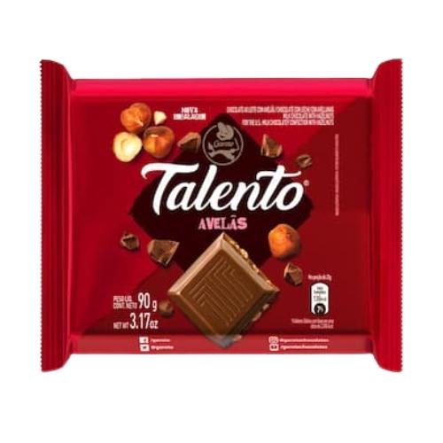Açúcar, leite em pó integral, massa de cacau, avelã, gordura vegetal, lactose, cacau em pó, gordura de manteiga desidratada, emulsificante: lecitina de soja e poliglicerol polirricinoleato e aromatizante. ALÉRGICOS: O CHOCOLATE TALENTO AVELÃS PODE CONTER TRAÇOS DE AVELÃ, SOJA, AMENDOIM, AMÊNDOA, CASTANHA DE CAJÚ, CASTANHA DO PARÁ, NOZES, AVEIA, CEVADA E TRIGO. CONTÉM GLÚTEN. CONTÉM LACTOSE.